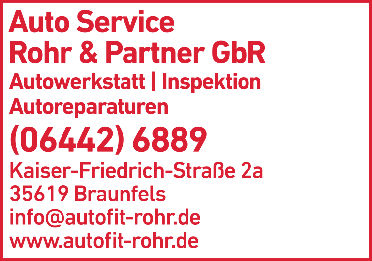 Die Adresse von Rohr & Partner GbR Autoservice lautet: Kaiser-Friedrich-Str. 2 a, 35619 Braunfels