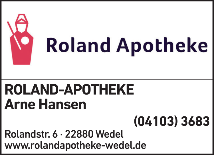 Die Adresse von Roland-Apotheke, Arne Hansen lautet: Rolandstr. 6, 22880 Wedel