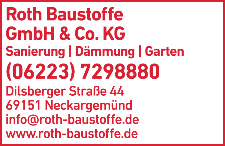 Die Adresse von Roth Baustoffe GmbH & Co.KG lautet: Dilsberger Str. 44, 69151 Neckargemünd