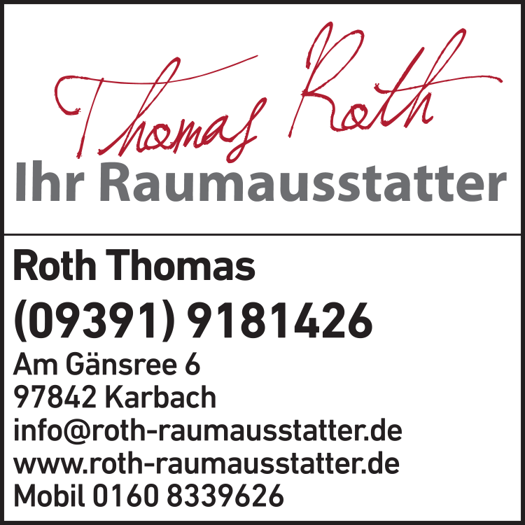 Die Adresse von Roth Thomas Raumausstatter lautet: Am Gänsree 6, 97842 Karbach