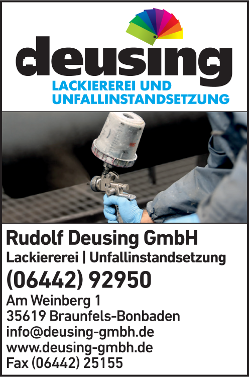 Die Adresse von Rudolf Deusing GmbH Lack- u. Unfallinstandsetzung lautet: Am Weinberg 1, 35619 Braunfels-Bonbaden