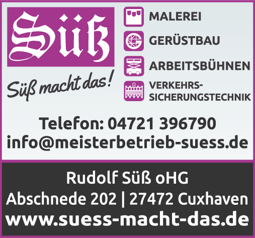 Rudolf Süß oHG Malerei & Gerüstbau 04721 39 67 90 Cuxhaven Abschnede 202 27472 Groden https://102m.de/02/0206/2236/5052929_suess_logo_200x100.png 5 5 1
