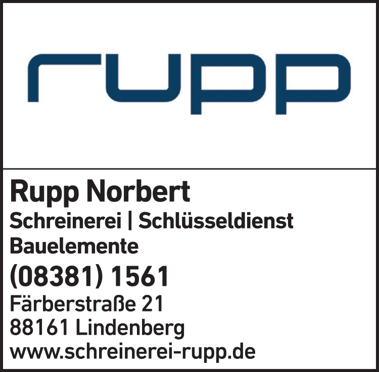 Die Adresse von Rupp Norbert Schreinerei lautet: Färberstr. 21, 88161 Lindenberg i.Allgäu