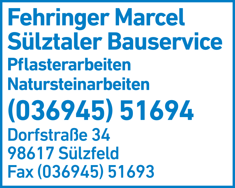 Die Adresse von Sülztaler Bauservice Fehringer Marcel lautet: Dorfstr. 34, 98617 Sülzfeld