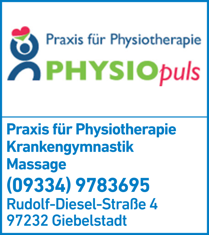 Die Adresse von SALVEO GmbH PHYSIOpuls Praxis für Physiotherapie lautet: Rudolf-Diesel-Str. 4, 97232 Giebelstadt