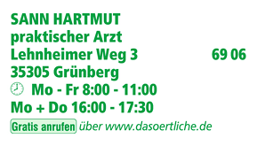 Die Adresse von SANN HARTMUT praktischer Arzt lautet: Lehnheimer Weg 3, 35305 Grünberg