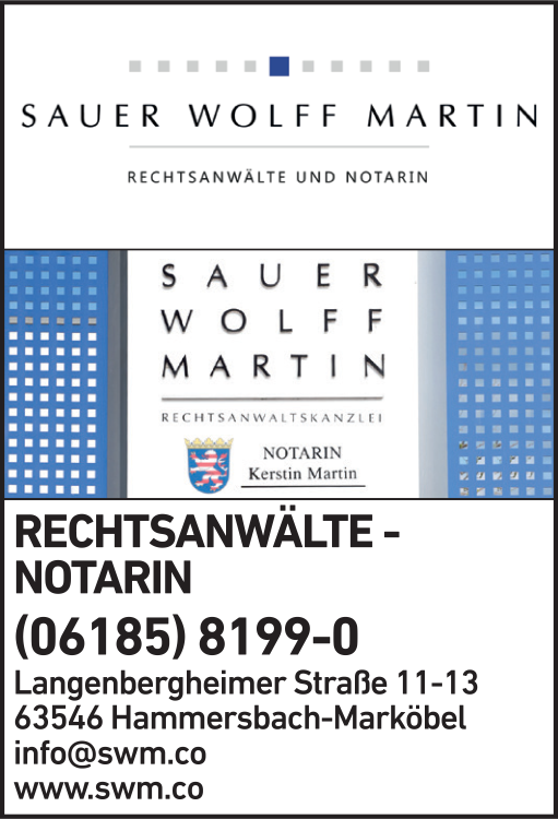 SAUER WOLFF MARTIN Rechtsanwälte, Fachanwälte und Notarin 06185 81 99-0 Hammersbach Langenbergheimer Str. 11-13 63546 Marköbel 4 5 9
