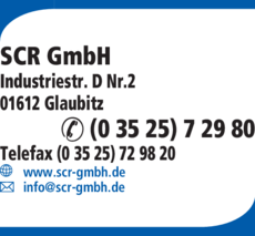 Die Adresse von SCR GmbH lautet: Industriestr. D 2, 01612 Glaubitz