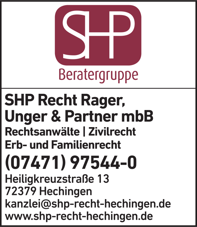 Die Adresse von SHP Recht - Rager Unger & Partner mbB lautet: Heiligkreuzstr. 13, 72379 Hechingen