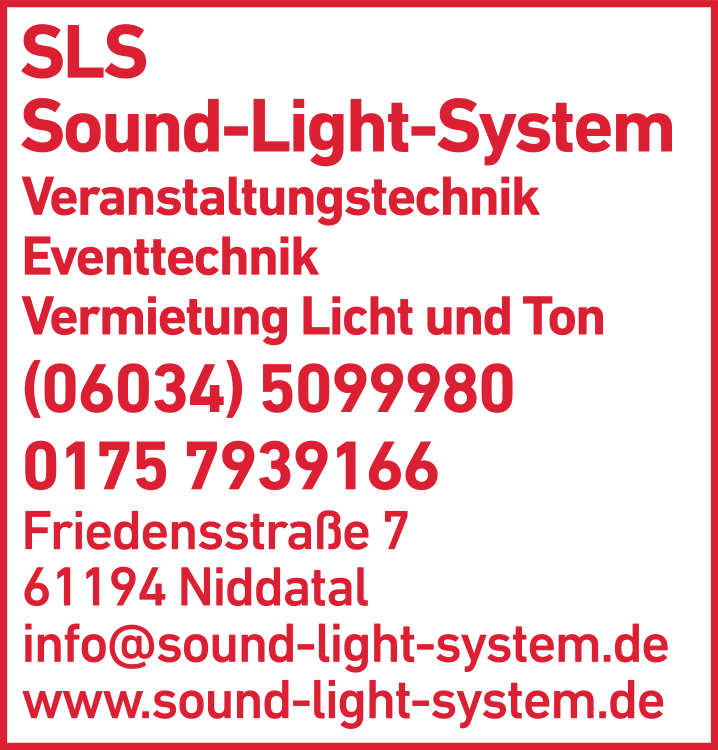Die Adresse von SLS Sound-Light-System Eventservice lautet: Friedensstr. 7, 61194 Niddatal