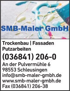 Die Adresse von SMB MALER GmbH lautet: An der Pulvermühle 6, 98553 Schleusingen