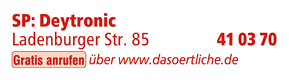 SP: Deytronic hat montags bis freitags von 10:00 - 12:30 Uhr und 14:00 - 18:30 Uhr und samstags von 09:00 - 14:00 Uhr geöffnet.