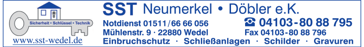 Die Adresse von SST Neumerkel Döbler e.K. Schlüsseldienst lautet: Mühlenstr. 9, 22880 Wedel