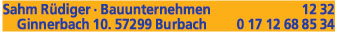 Die Adresse von Sahm Rüdiger lautet: Ginnerbach 10, 57299 Burbach
