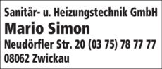 Wie lautet die Adresse von Sanitär- u. Heizungstechnik GmbH, Mario Simon?