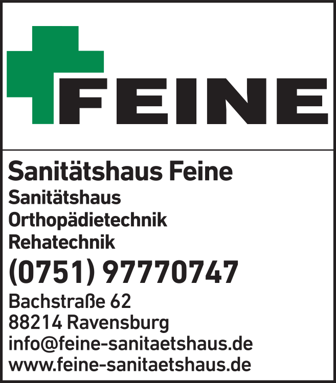 Die Adresse von Sanitätshaus Feine lautet: Bachstr. 62, 88214 Ravensburg