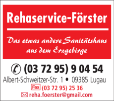 Sanitätshaus Rehaservice Förster 037295 9 04 54 Lugau Albert-Schweitzer-Str. 1 09385 https://ies.v4all.de/0122/OETB/0235/3/0923/59190923_200x100px.png 5 5 1
