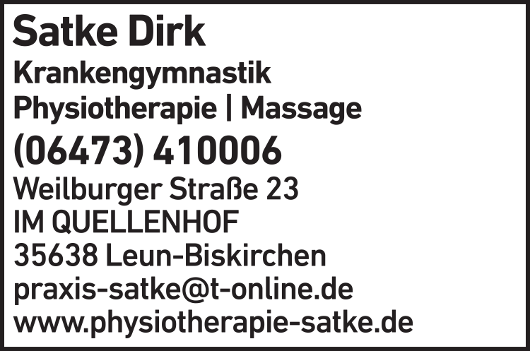 Die Adresse von Satke Dirk Krankengymnastik lautet: Weilburger Str. 23, 35638 Leun