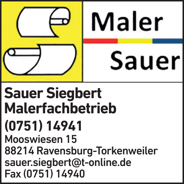 Die Adresse von Sauer Siegbert Malerbetrieb lautet: Mooswiesen 15, 88214 Ravensburg