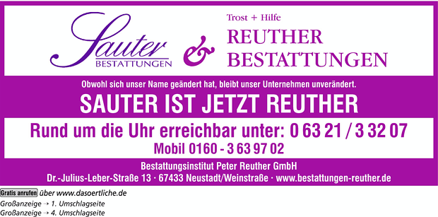 Sauter Bestattungen 06321 3 32 07 Neustadt an der Weinstraße Dr.-Julius-Leber-Str. 13 67433 https://media.roeser-online.de/02/123/LOGO/000/287/257_200x100.png