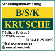 Schädlingsbekämpfung B/S/K Krusche 03441 25 09 99 Elsteraue Tröglitzer Feldstr. 2 06729 Tröglitz https://ies.v4all.de/0122/OETB/0232/9/0429/20210429_200x100px.png
