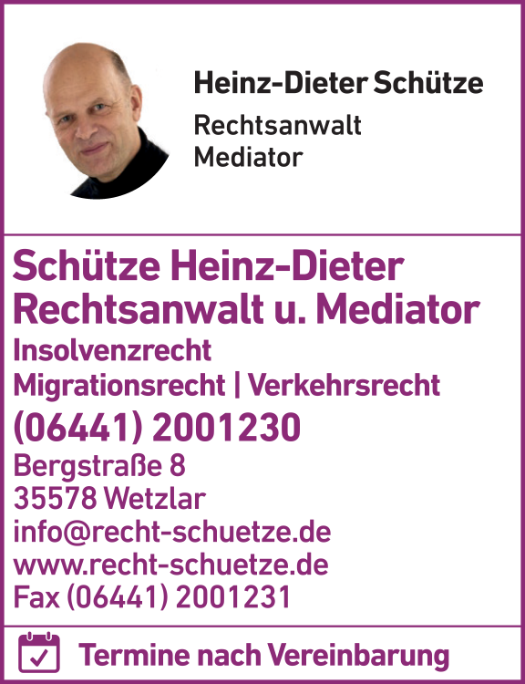 Die Adresse von Schütze Heinz-Dieter Rechtsanwalt lautet: Bergstr. 8, 35578 Wetzlar