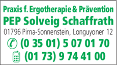 Schaffrath, Solveig Praxis f. Ergotherapie und Prävention 03501 5 07 01 70 Pirna Longuyoner Str. 12 01796 de.teleauskunft.oetb.webapp2.detail.Graphic@37da589