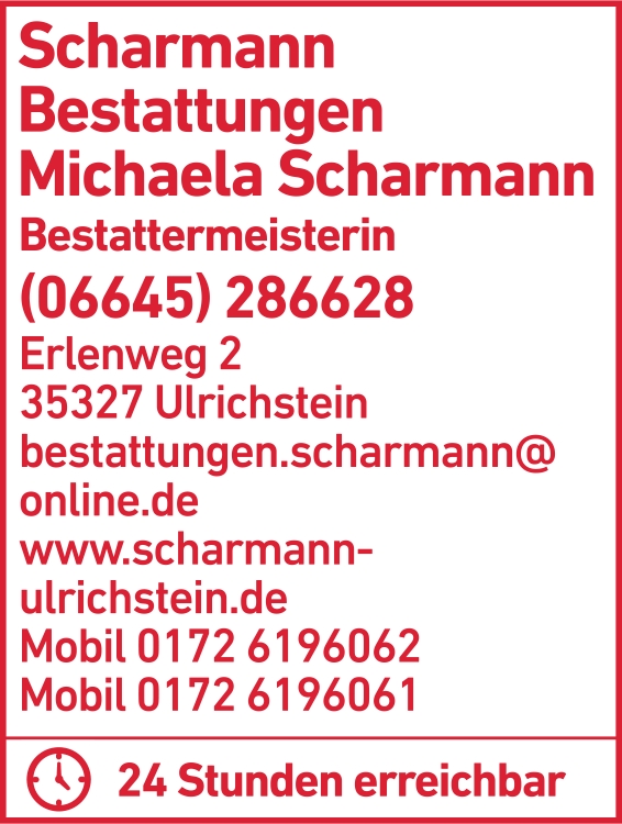 Die Adresse von Scharmann Bestattungen lautet: Erlenweg 2 a, 35327 Ulrichstein