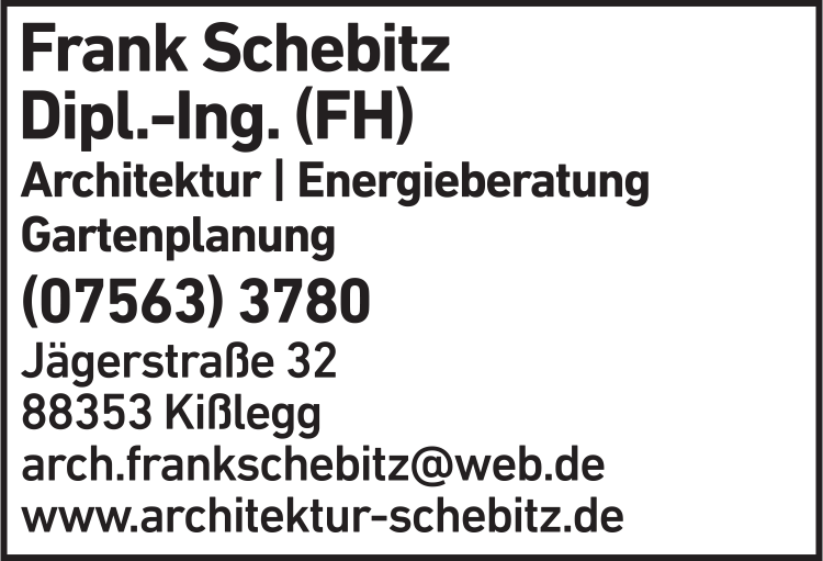Schebitz Frank Dipl. - Ing. Architekt 07563 37 80 Kißlegg Jägerstr. 32 88353