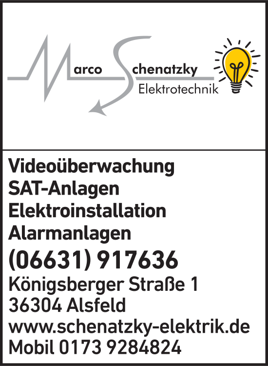 Schenatzky Marco Elektro 06631 91 76 36 Alsfeld Königsberger Str. 1 36304 Leusel