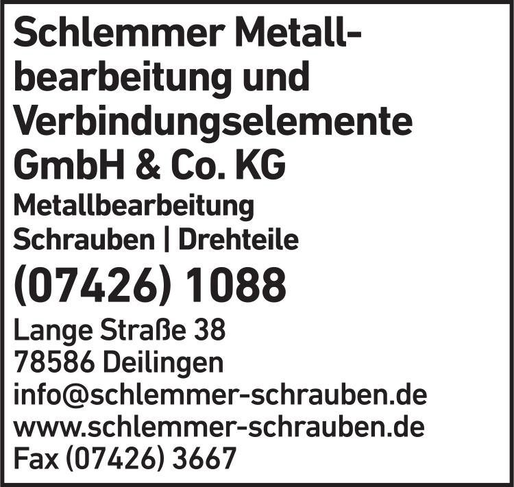 Die Adresse von Schlemmer Metallbearbeitung & Verbindungselemente GmbH & Co. KG lautet: Lange Str. 38, 78586 Deilingen