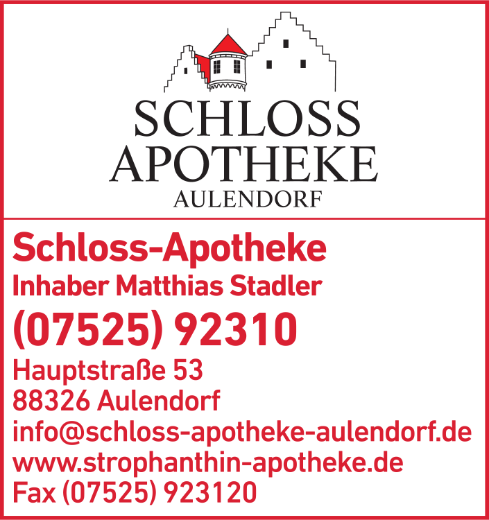 Die Adresse von Schloss-Apotheke Inh. Matthias Stadler lautet: Hauptstr. 53, 88326 Aulendorf