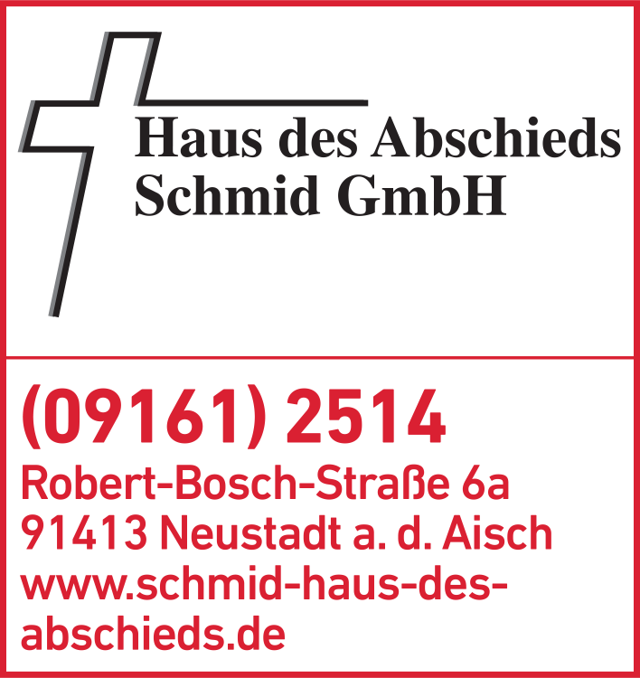 Die Adresse von Schmid GmbH Haus des Abschieds lautet: Robert-Bosch-Str. 6 a, 91413 Neustadt a. d. Aisch