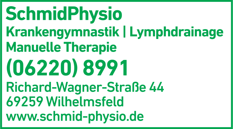 Die Adresse von SchmidPhysio Verena Ehret Praxis für Physiotherapie lautet: Richard-Wagner-Str. 44, 69259 Wilhelmsfeld