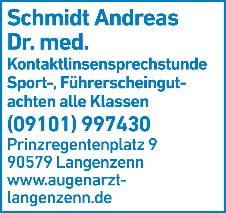 Die Adresse von Schmidt Andreas Facharzt für Augenheilkunde lautet: Prinzregentenplatz 9, 90579 Langenzenn