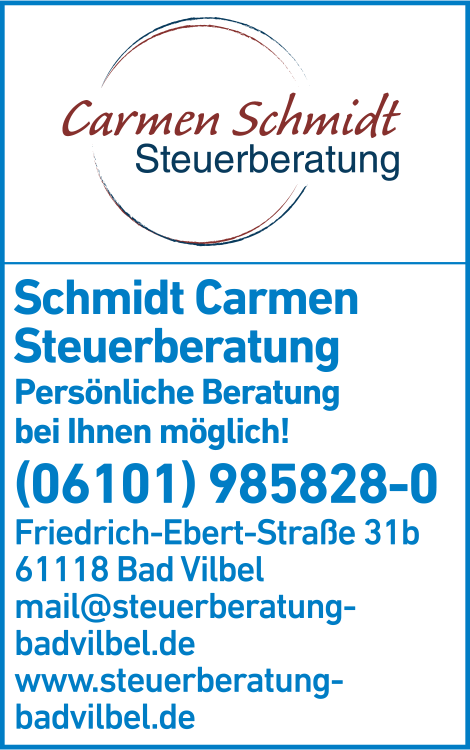 Die Adresse von Schmidt Carmen Steuerberatung lautet: Friedrich-Ebert-Str. 31 b, 61118 Bad Vilbel
