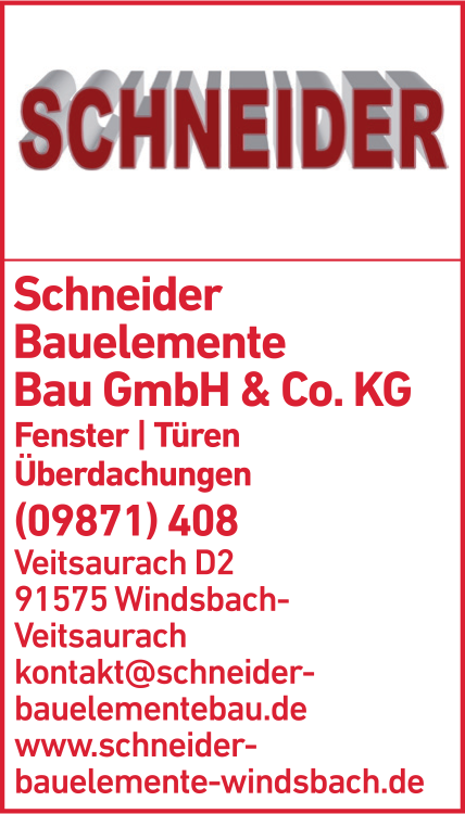 Die Adresse von Schneider Bauelemente Bau GmbH & Co. KG lautet: Veitsaurach D 2, 91575 Windsbach