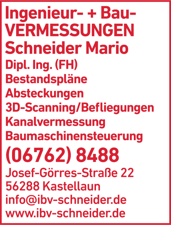 Die Adresse von Schneider Mario Dipl. - Ing. (FH) Vermessungsbüro lautet: Josef-Görres-Str. 22, 56288 Kastellaun