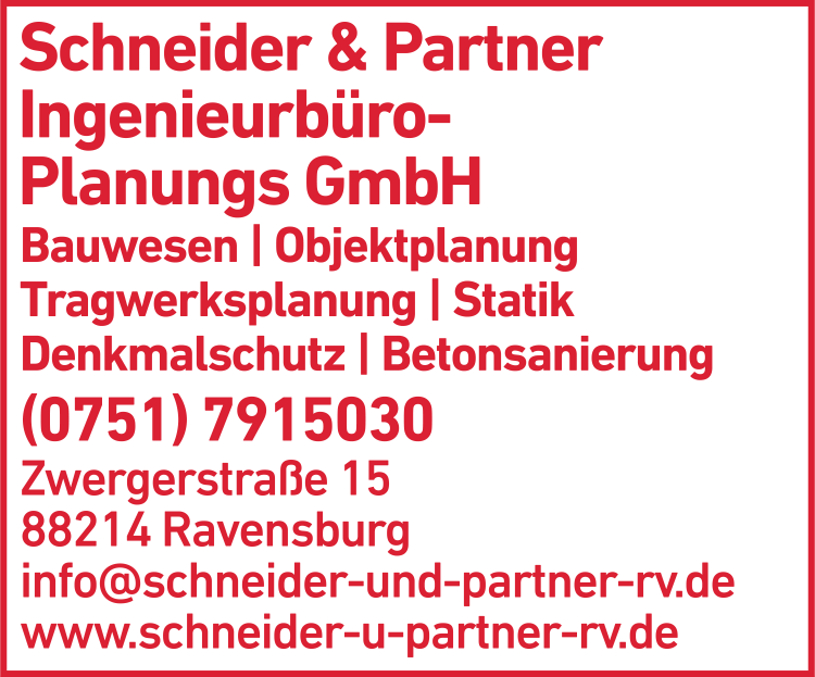 Die Adresse von Schneider & Partner Ingenieurbüro-Planungs GmbH lautet: Zwergerstr. 15, 88214 Ravensburg
