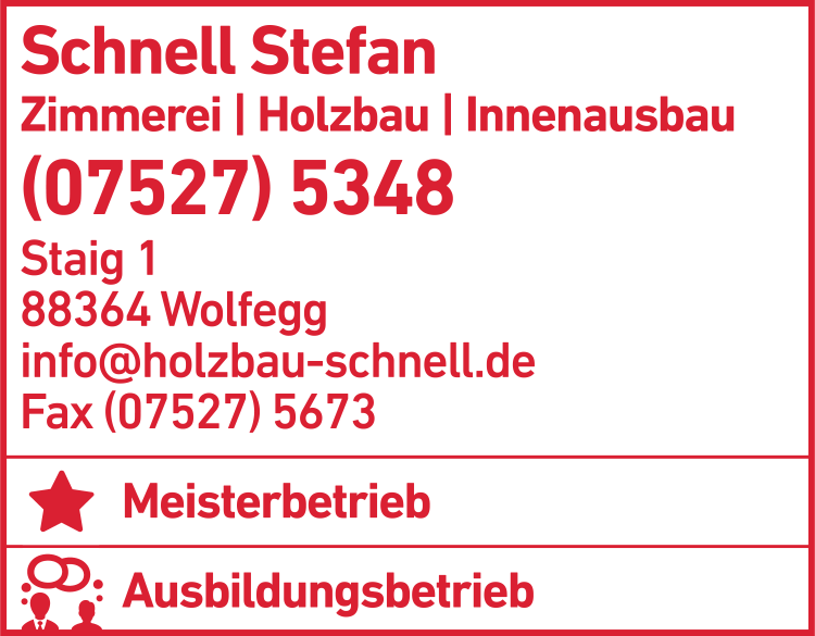 Die Adresse von Schnell Stefan Zimmerei lautet: Staig 1, 88364 Wolfegg