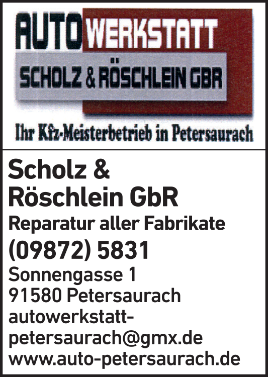 Scholz & Röschlein GbR Autowerkstatt 09872 58 31 Petersaurach Sonnengasse 1 91580