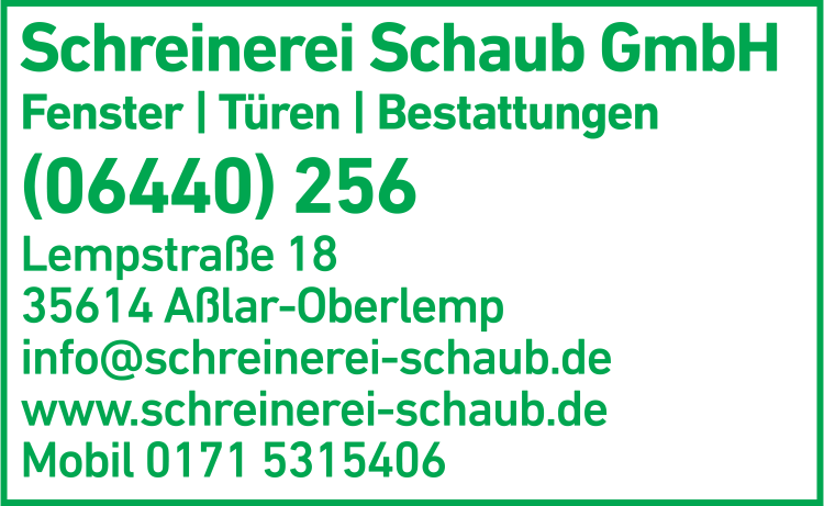 Die Adresse von Schreinerei Schaub GmbH lautet: Lempstr. 18, 35614 Aßlar-Oberlemp