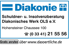 Die Adresse von Schuldner- u. Insolvenzberatung Diakonisches Werk OLS e.V. lautet: Hohensteiner Chaussee 100, 15344 Strausberg