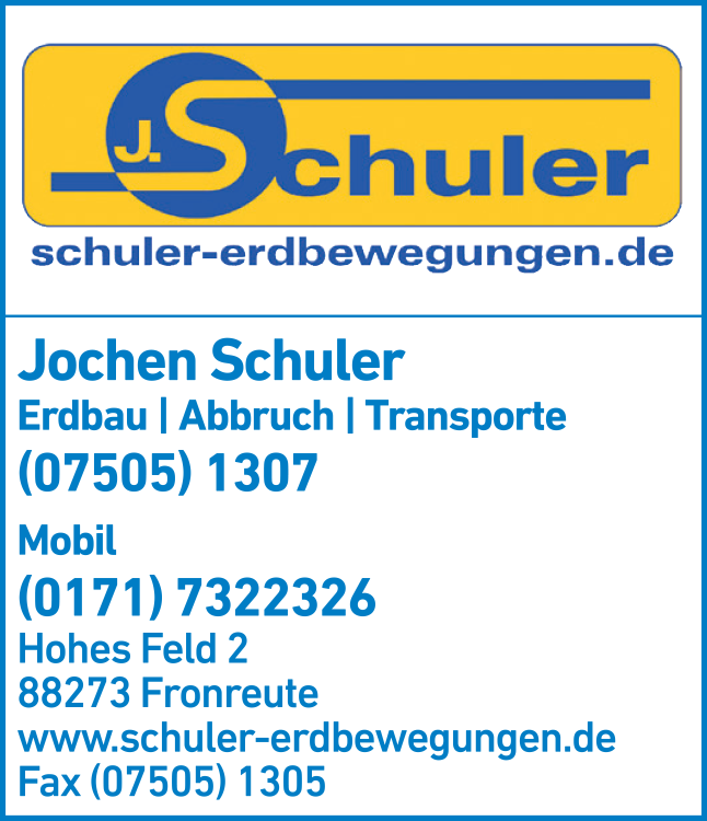 Die Adresse von Schuler Jochen Erdarbeiten lautet: Hohes Feld 2, 88273 Fronreute