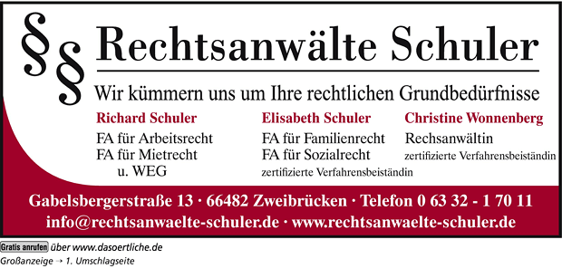 Die Adresse von Schuler Richard & Elisabeth Rechtsanwälte lautet: Gabelsbergerstr. 13, 66482 Zweibrücken