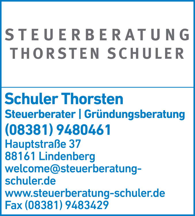 Die Adresse von Schuler Thorsten Steuerberater lautet: Hauptstr. 37, 88161 Lindenberg