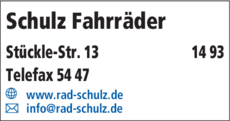 Die Adresse von Schulz Fahrräder lautet: Stückle-Str. 13, 77955 Ettenheim