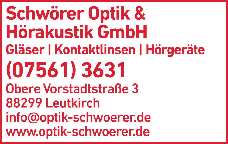 Die Adresse von Schwörer Optik & Akustik GmbH lautet: Obere Vorstadtstr. 3, 88299 Leutkirch