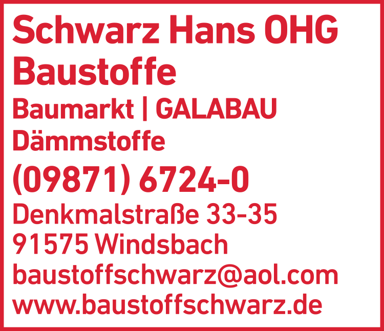 Die Adresse von Schwarz Baustoffe lautet: Denkmalstr. 33-35, 91575 Windsbach