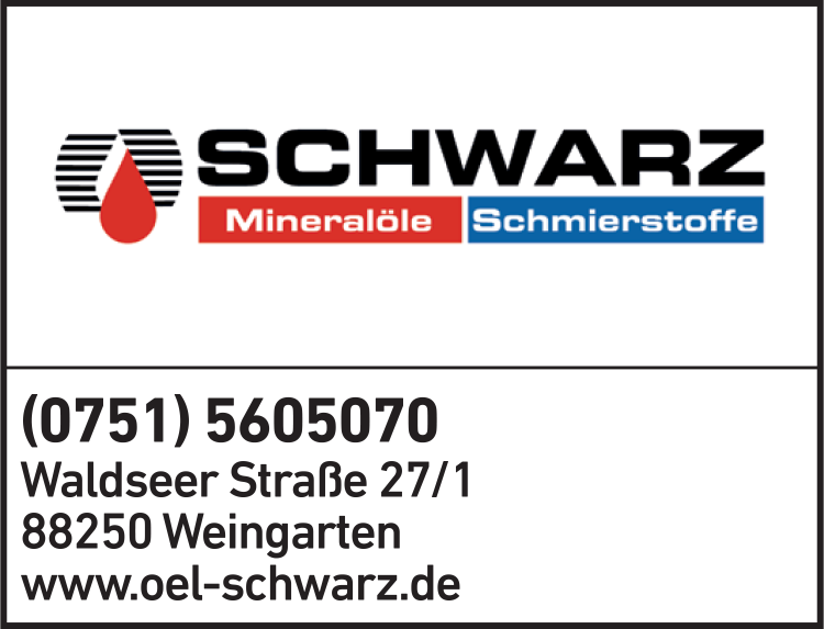 Die Adresse von Schwarz GmbH Mineralöle lautet: Waldseer Str. 27/1, 88250 Weingarten